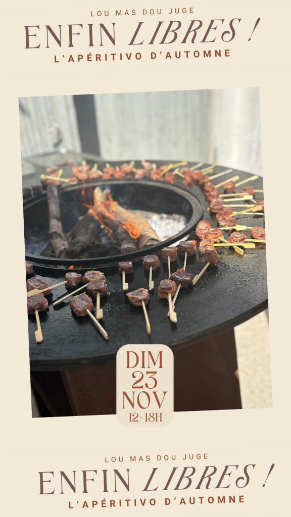 Enfin Libres !![]() Après des mois de travaux et d’embouteillages autour du pont du Petit-Rhône, on peut à nouveau venir au Mas… sans stress. Pour fêter ça, la famille Granier relance son APERITIVO : un dimanche d’automne chaleureux, gourmand et musical.Dimanche 23 novembre 2025 _ 12h à 18h à Lou Mas Dou Juge ⚠️ Uniquement sur réservation (places limitées) Au programme ![]() Un apéritif déjeunatoire (pas de passage à table) autour du brasero et de produits de saison.Des vins locaux soigneusement sélectionnés.DJ set by Bastien Peyre toute la journée.L’esprit qui fait le Mas : convivialité, copains, simplicité. Tarif tout compris (vins, eau minérale, café) : 60€ TTC PAR ADULTE37€ TTC PAR ENFANT _ 👉 Une carte de spiritueux sera disponible en supplément. ![]() Envie de souffler ? Venez quand vous voulez entre 12h et 18h, prenez un verre, grignotez au brasero, profitez du son… On célèbre la liberté retrouvée — les bouchons sont derrière nous ! Réservez dès maintenant votre place en nous contactant par mobile : 06 20 65 62 73 ou par email à info@loumasdoujuge.com. Nous avons hâte de fêter cet évènements en votre compagnie! Gilles, Guillaume et l’équipe du Mas doù Juge |